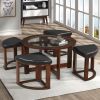 Solid Wood Glass Top Coffee Table with 4 StoolsMake your living room look and feel more inviting with the Kavanur coffee table set. The set's contemporary style and espresso finish perfectly complement any modern decor. The beveled glass top adds a touch of elegance, while the four matching stools with faux leather upholstery provide comfortable seating for guests. The stools snugly fit under the table to save space, making this set perfect for smaller living rooms.Table: 36" DIA X 20" HStool: 24"W X16"D X17"H