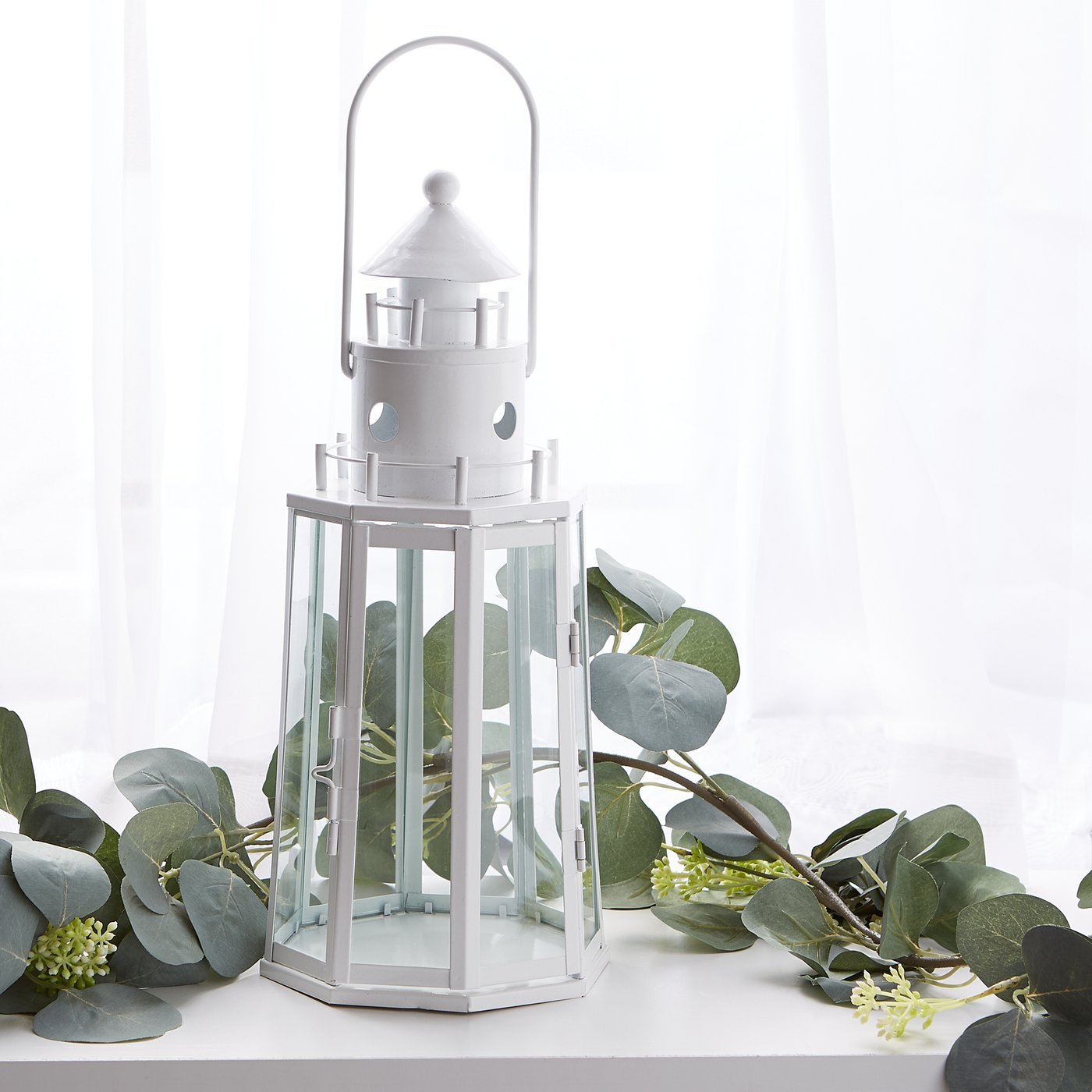 Decorate your home like a sleepy seaside village with this charming lighthouse lantern. With glass window panes, a contemporary galvanized metal top, and a metal handle for easy hanging this lantern is both sturdy and chic. Place a candle or LED of your choice inside the lantern to illuminate your space in a soft and serene glow. Use it to create a centerpiece for parties or special events, display on a countertop or coffee table, or to accent beach themed décor - available in a variety of styles and colors!